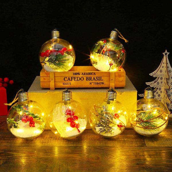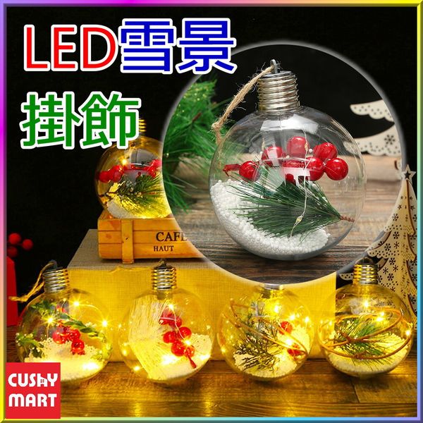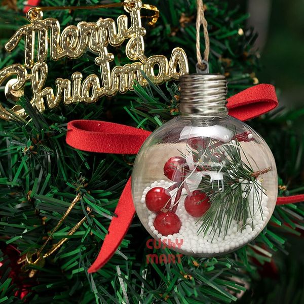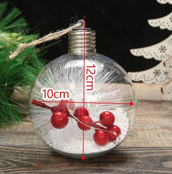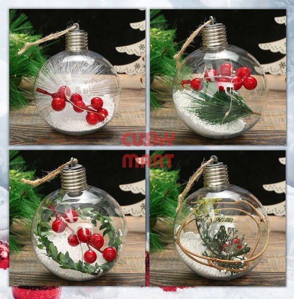 - 高清透明聖誕樹掛飾, 內部裝有各種精美的季節性裝飾品,包括人造雪、紅漿果、Pip 漿果、松針、冷杉葉、雪松葉、迷你松果、綠葉,形成了一個系列微型雪景。