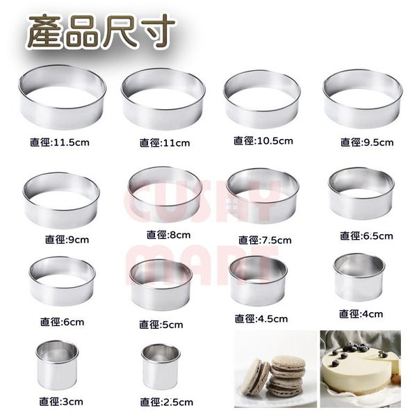 ➤ 多尺寸:包裝內含 14 種不同尺寸的不銹鋼糕點刀,直徑為 11.5cm / 11cm / 10.5cm / 9.5cm / 9cm / 8cm / 7.5cm / 6.5cm / 6cm / 5cm / 4.5cm / 4cm / 3cm /2.5cm。他們的身高都是3cm。使用這套圓形模具,您可以更輕鬆地製作出您想要的不同尺寸的圓形餅底。