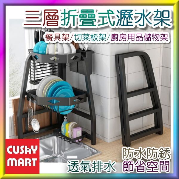 AGERU-多功能廚房水槽邊角三層折疊式瀝水架 (黑色)