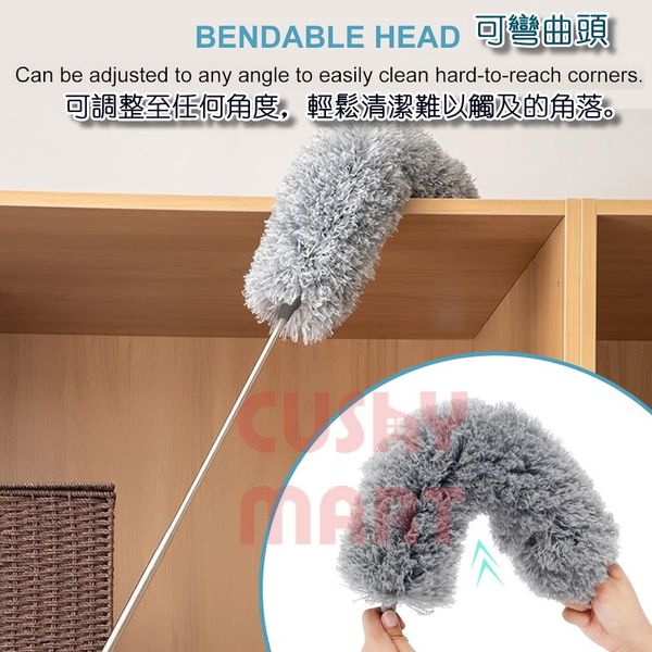 [可彎曲超細纖維掃頭]:360°可彎曲掃頭具有強力靜電吸附作用,可快速捕捉和吸附吊扇、牆壁、高角等處的細小灰塵和毛髮。