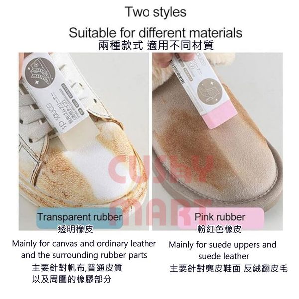 2) 完美鞋用,物理清潔、增白,鞋類去污橡皮擦採用物理去污原理,快速去除灰塵污垢,雙效清潔,內部含有拋光顆粒,在清潔過程中重塑、擦亮你的鞋。