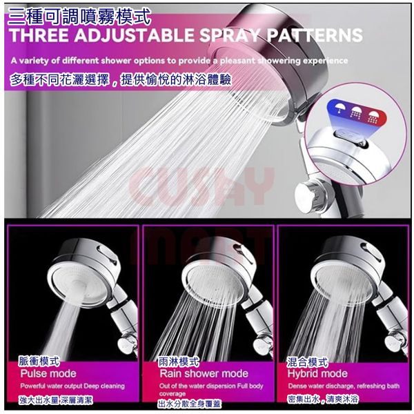 【功能】3種噴霧方式:噴霧、雨淋、混合,您可以輕鬆按下切換按鈕,每種模式都能帶給您舒適的沐浴。淋浴噴頭可左右旋轉360度,上下60度旋轉。您可以移動淋浴噴頭到達身體的複雜部位,這樣您就可以為孩子或寵物洗澡,或清潔浴室裡的污垢。