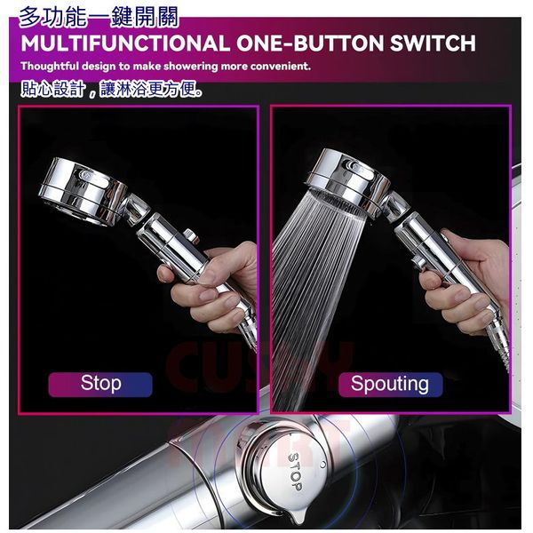 【設計】加壓節水和獨特的一鍵設計,節省水和更好的淋浴體驗,只需按下「停止」按鈕即可保持水溫,無需關閉閥門。 當您將按鈕旋轉45°時,水壓也會改變。 貼心的設計讓您的淋浴更加舒適方便,特別適合成人、殘障人士、兒童、嬰兒和寵物。