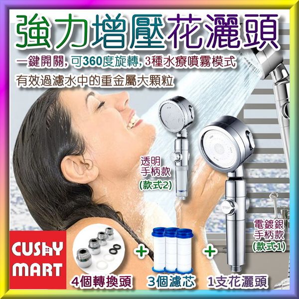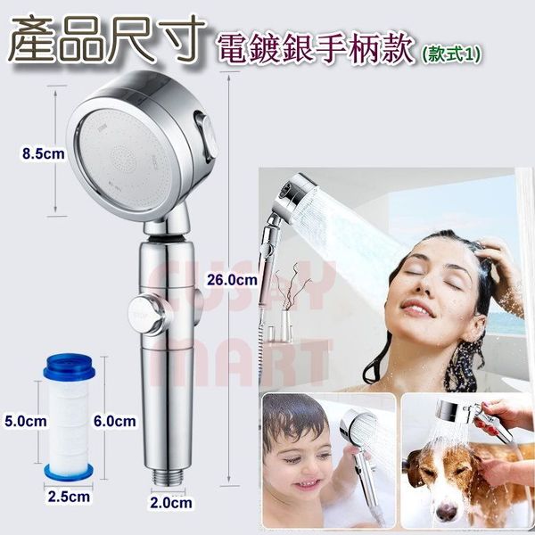 AGERU-三檔式增壓過濾花灑頭|多角度可調淋浴噴頭 (內附:濾芯x3|轉換接頭x4)套裝 [銀色手柄款]