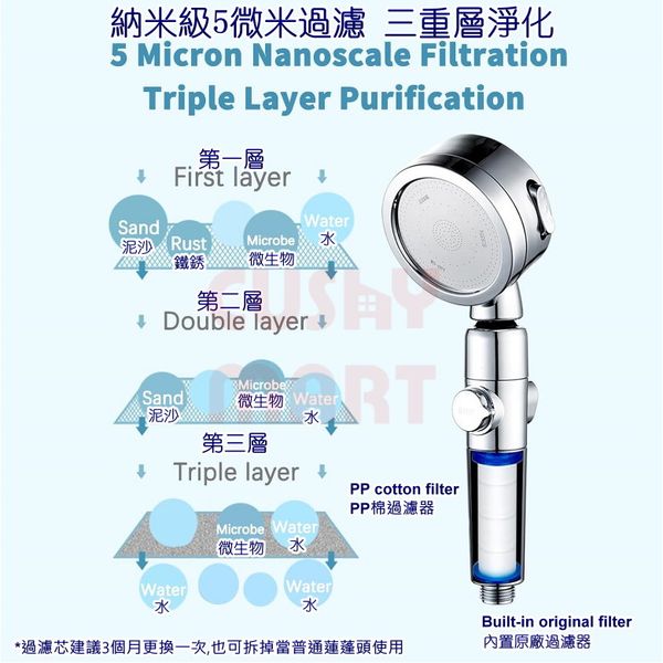 【保養】花灑噴頭各部位可拆卸,讓污垢和細菌無處藏身。濾芯建議每三個月更換一次。當然,您可以將過濾器拆下,作為普通淋浴器使用。