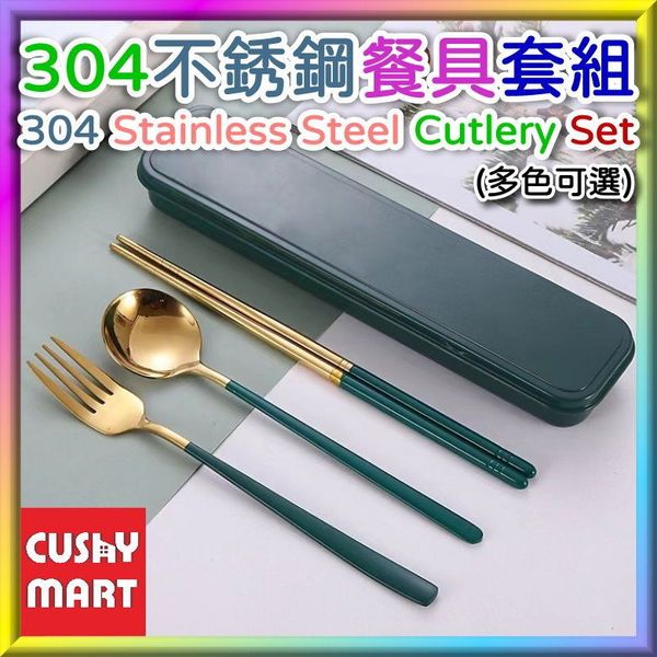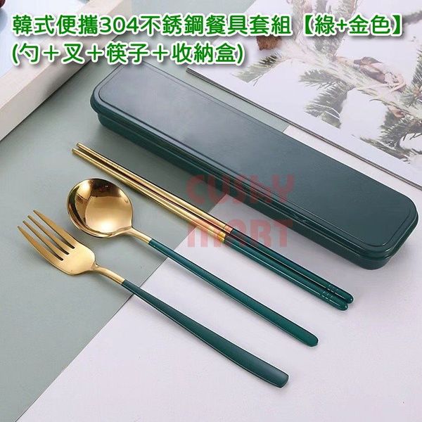 AGERU-韓式便攜304不銹鋼餐具套組(勺+叉+筷子+收納盒)【綠+金色】