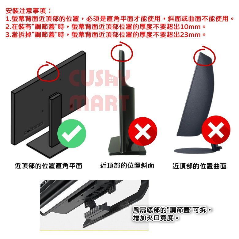 2.在裝有"調節蓋"時,螢幕背面近頂部位置的厚度不要超出10mm。