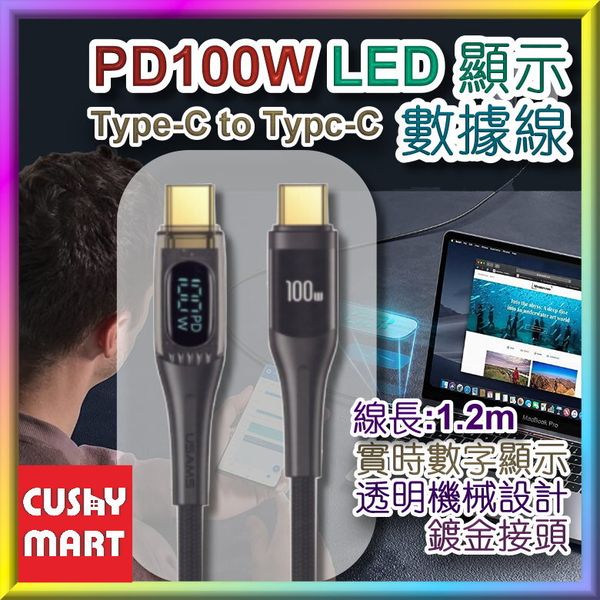 USAMS-PD100W數顯充電線 數據線 USB線 (Type C 轉 Type C 1.2米)[黑色](平行進口)