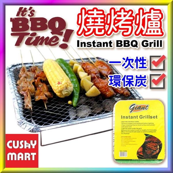 包含: 加厚鍍鋅鋁箔燒烤爐、環保炭、引燃紙、碟形燒烤網、直立架