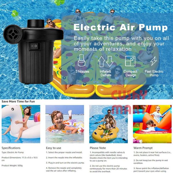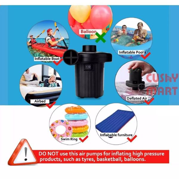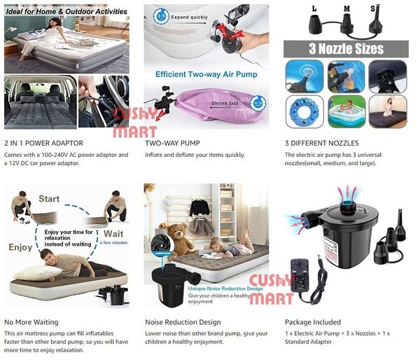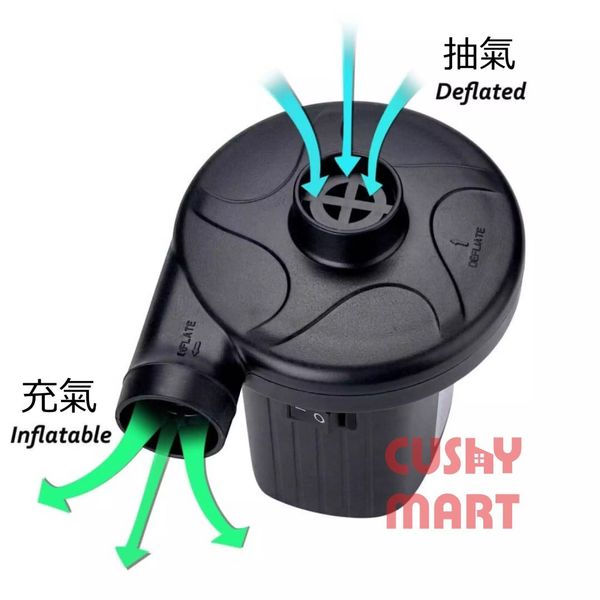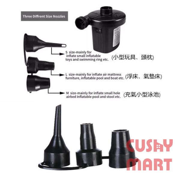 - 配置3個充氣咀, 可用於抽真空收納袋、充氣床、車中泊氣墊、充氣沙氣、瑜伽球、充氣浮床、泳池、泳圈等